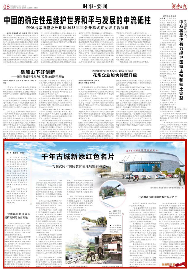 “我们将立足地域资源优势和人文历史特点,持续做好国防教育特色文章,打响国防教育红色名片。”武冈市委副书记、市长龚畅介绍,当前,该市正加快黄埔军校第二分校旧址中山堂、李明灏故居陈列布展,启动4A级景区创建,致力将武冈打造成湘西南地区一张国防教育的响亮名片。