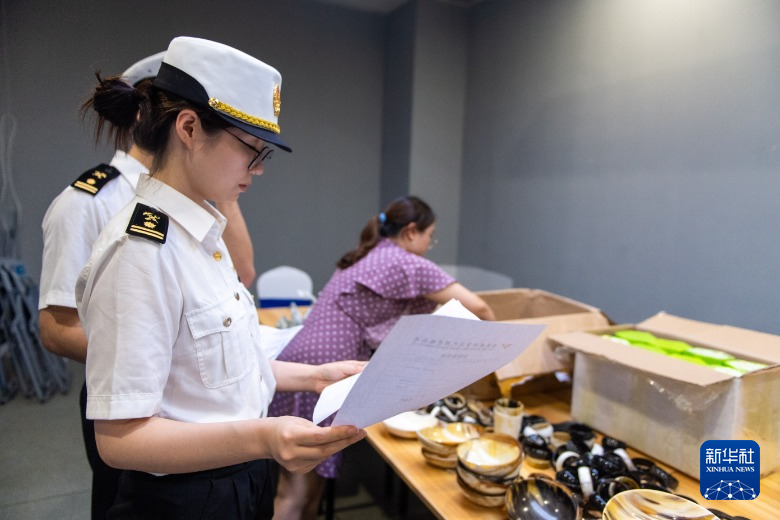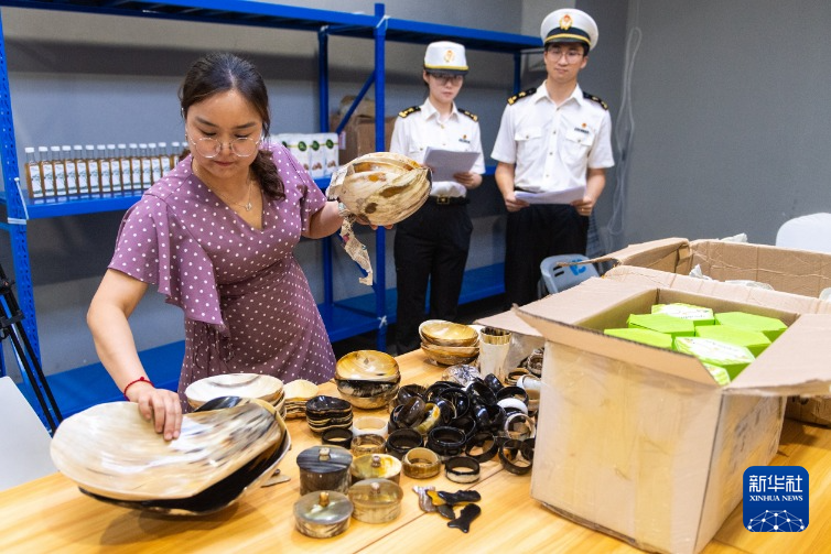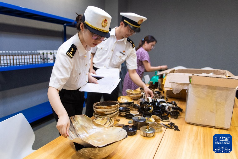 6月19日,在长沙国际会展中心,第三届中非经贸博览会组委会工作人员(右一)取出包裹内的展品,长沙海关所属星沙海关关员进行核对。