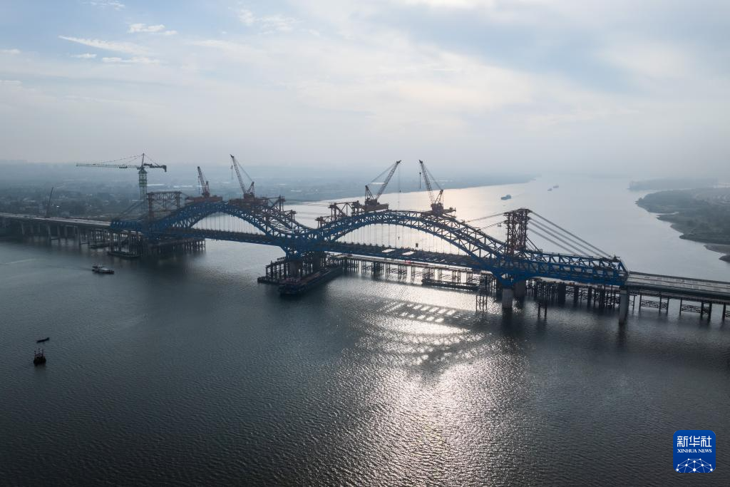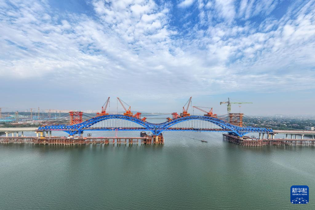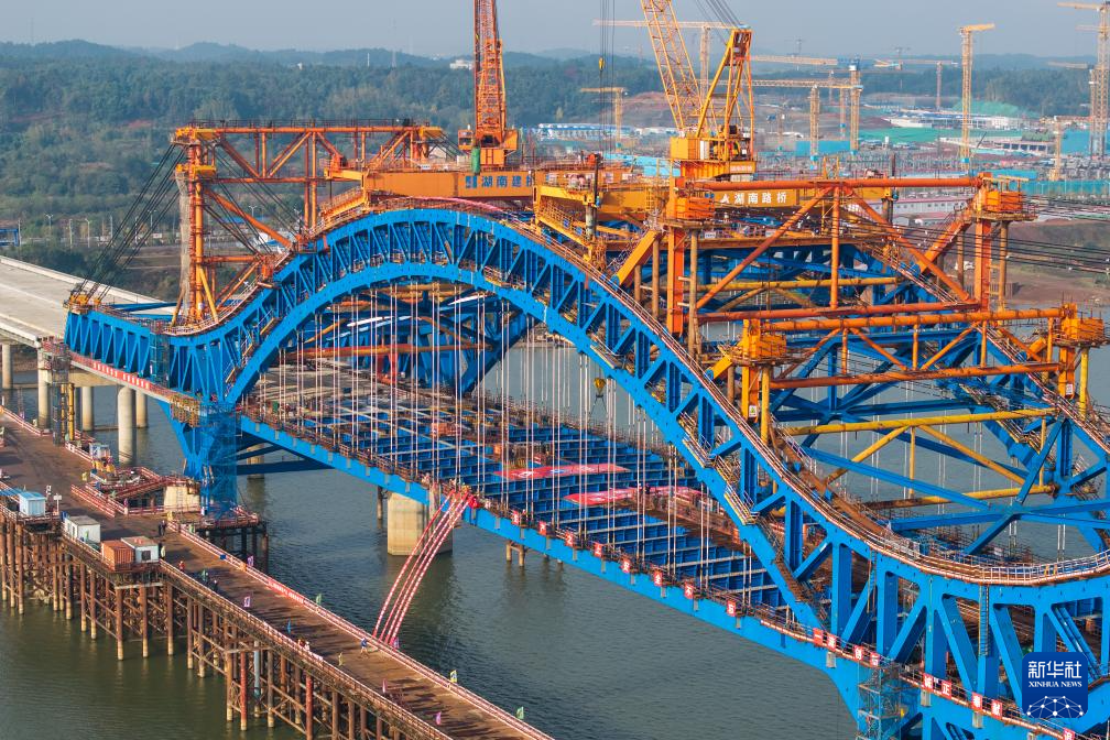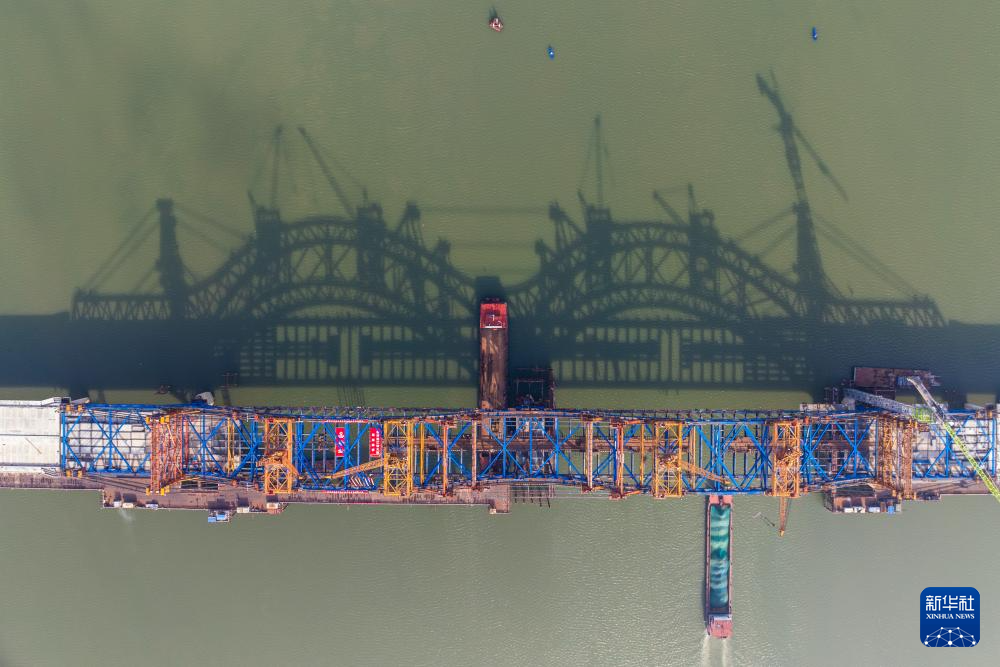 这是11月26日拍摄的长沙暮坪湘江特大桥合龙施工现场(无人机照片)。新华社记者 陈思汗 摄