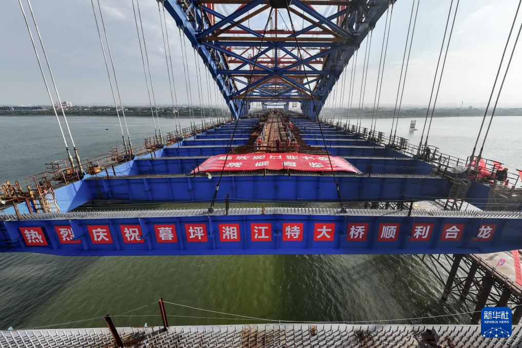当日,随着主跨合龙段最后一段横梁安装完成,长沙暮坪湘江特大桥顺利合龙。