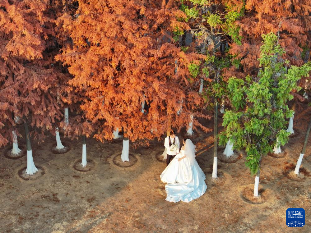 12月18日,一对新人在湖南松雅湖国家湿地公园拍摄婚纱照(无人机照片)。新华社记者 陈泽国 摄