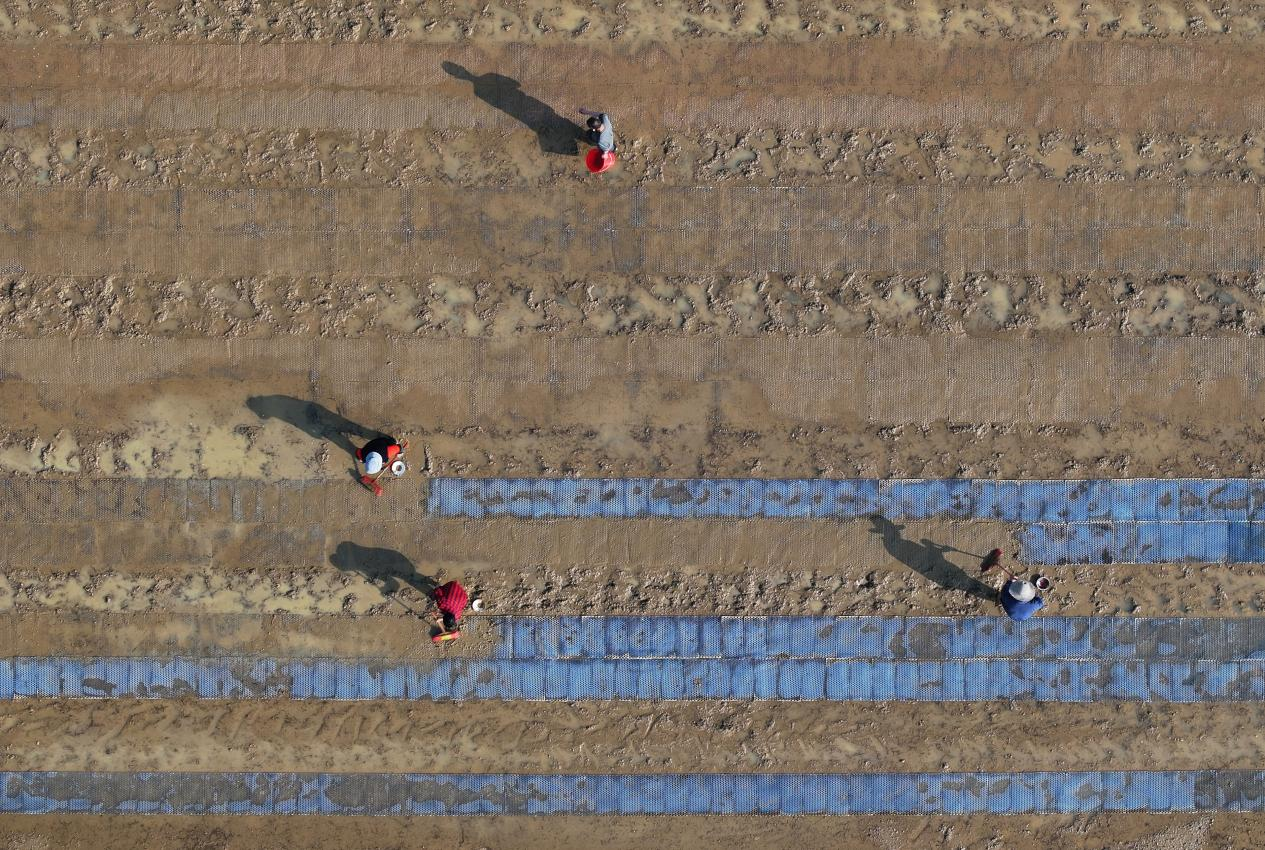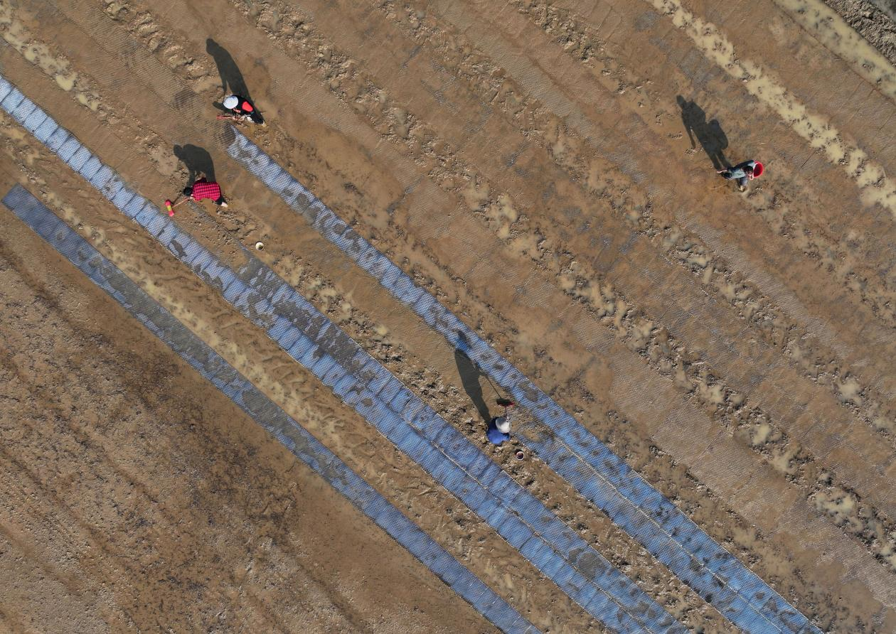 4月1日,常宁市宜阳街道办事处新和村农民正在田间育秧。(无人机照片)钱辉 摄