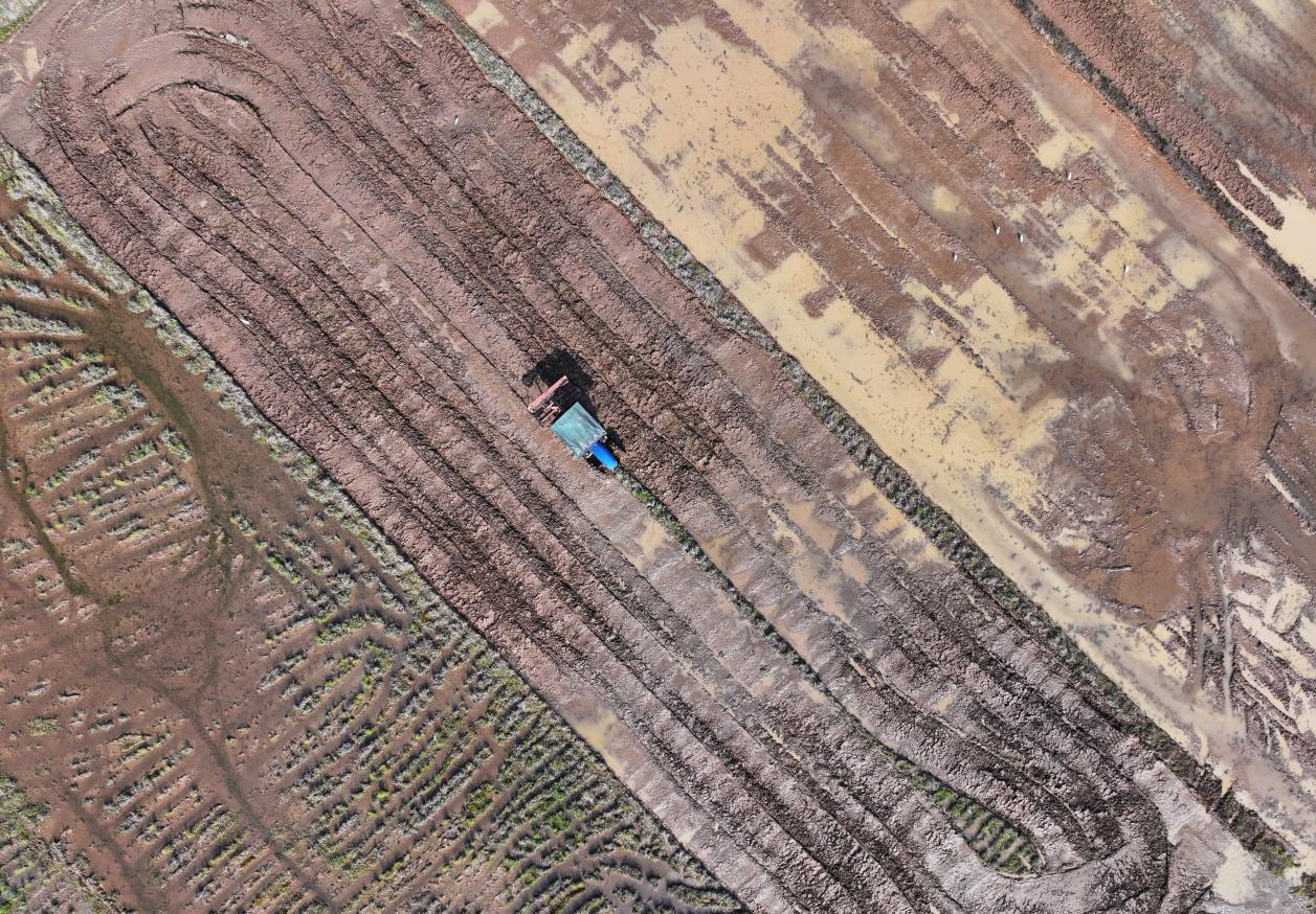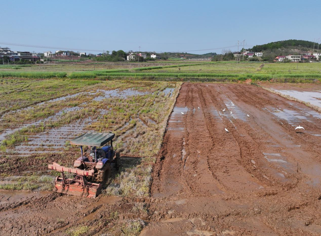 4月1日,在常宁市柏坊镇宜元村,村民驾驶拖拉机正在翻耕农田。(无人机照片)钱辉 摄