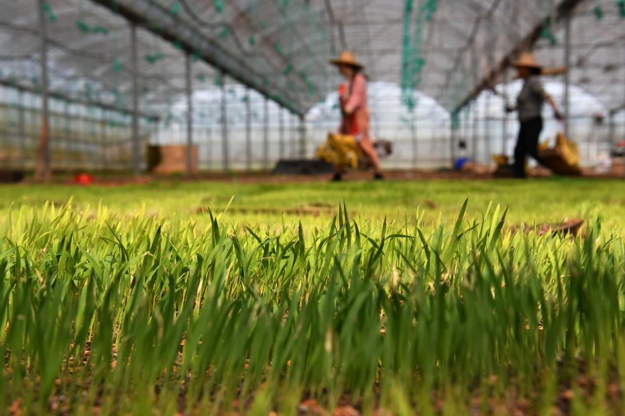 4月1日,在常宁市宜阳街道办事处塘湾村集中育秧大棚内,工人正在察看秧苗长势。钱辉 摄