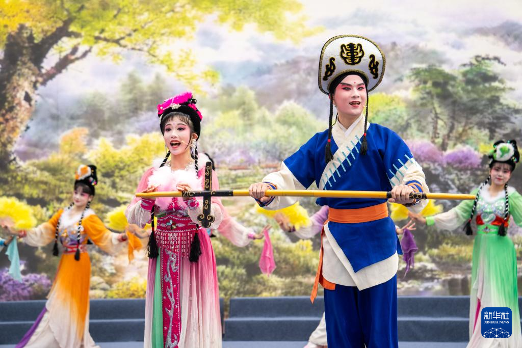 10月29日,在长沙市开福区东风路街道东风大舞台,湖南艺术职业学院学生为市民表演戏曲《刘海砍樵》。新华社记者 陈思汗 摄pagebreak