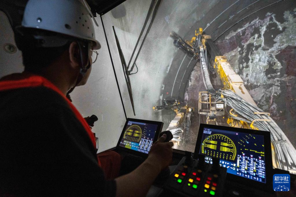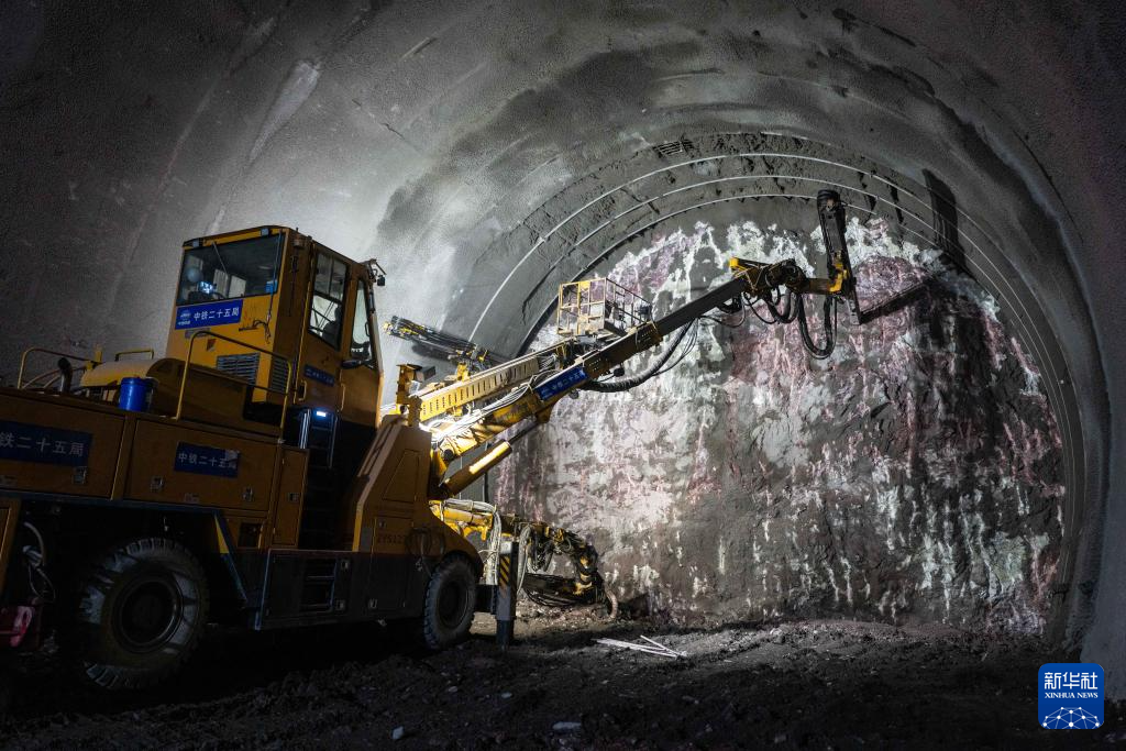 11月1日,在邵永高铁东安隧道施工现场,中铁二十五局工人操作三臂凿岩台车进行钻孔作业。新华社记者 陈思汗 摄