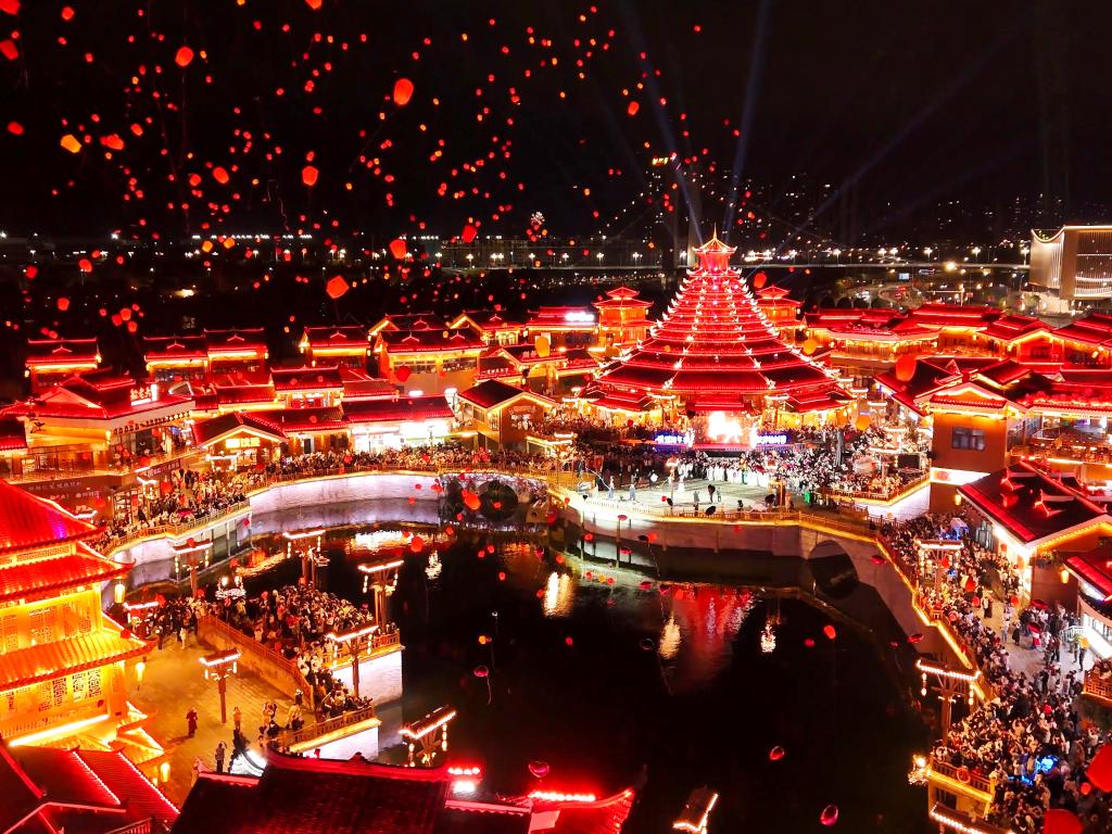 临近午夜,榆树湾·青春广场迎来全天氛围最高潮,游客们在孔明灯灯面上写下新年愿望,在工作人员的指引下有序放飞。点点灯火随风飘荡,与夜空融为一体,构成“千盏飞灯映星河”的浪漫画面。