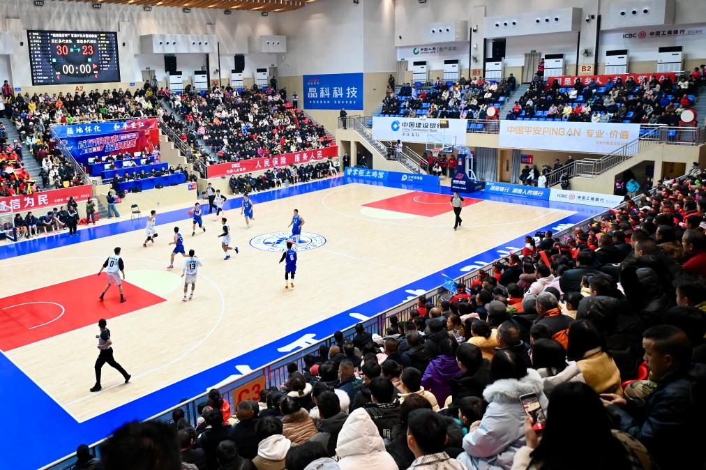 图为1月2日晚拍摄的首届怀化市篮球联赛芷江队与通道队比赛现场。新华社发(张卓 摄)