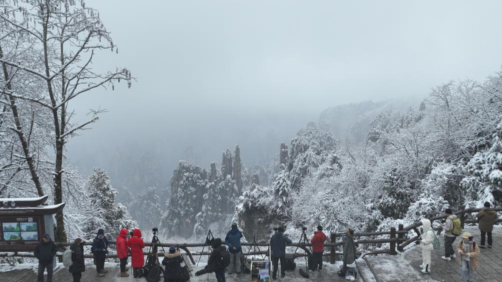1月2日,游客在湖南张家界武陵源风景名胜区欣赏雪景。新华社发(张洪涛 摄)