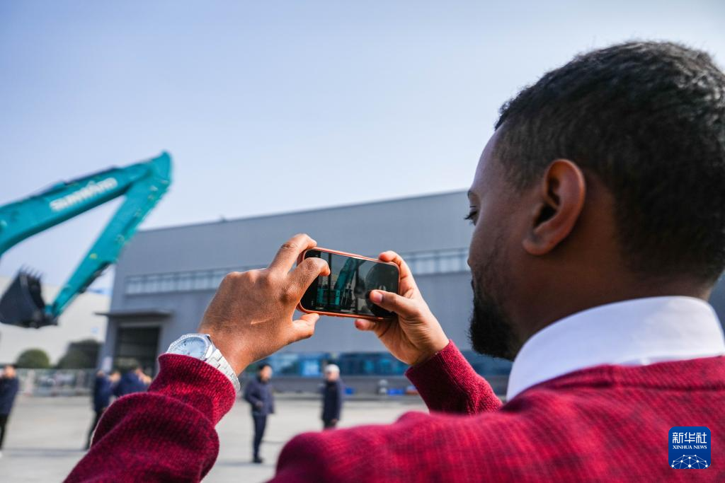 1月6日,在长沙山河工业城,客户代表在拍摄SWE1650FLR加长臂挖掘机。新华社记者 陈思汗 摄