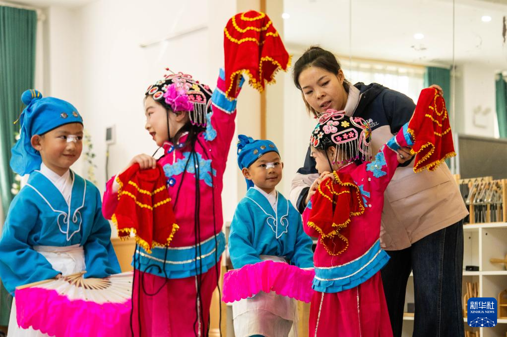 1月13日,在南县第三实验幼儿园,老师在指导学生练习南县地花鼓。新华社记者 陈思汗 摄pagebreak