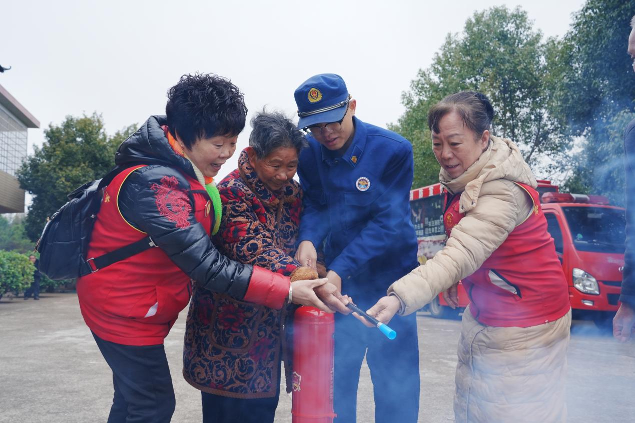 培训结束后,“平安守护联合服务队”组织行动方便的老人开展了一场应急疏散演练。在宣传员和志愿者的引导下,老人们按照疏散路线,用湿毛巾捂住口鼻,有序地撤离至安全区域。随后,宣传员现场演示了灭火器的正确使用方法,并指导部分老人和敬老院工作人员进行了油盆灭火实操,让他们在实践中掌握逃生自救技能。