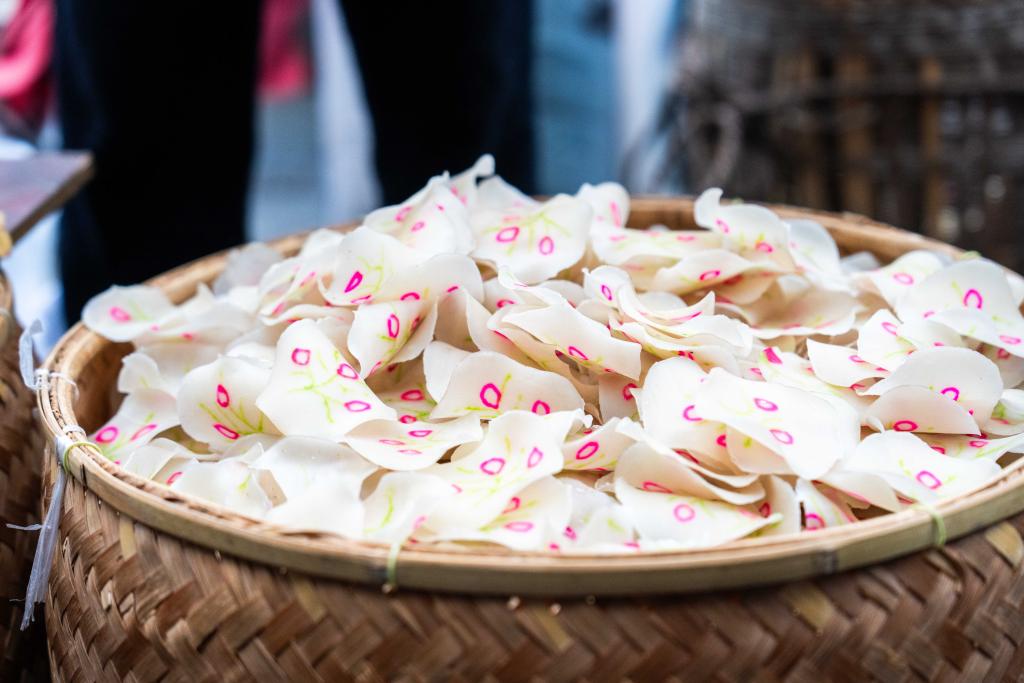 她们售卖的土货是当地逢年过节不可或缺的食物,主要分两大类——“坛子菜”和“换茶”。“坛子菜”即腌菜,包括霉豆腐、卜豆角、黄子肉、萝卜米等;“换茶”即茶点,除了作为湖南“省级茶点”的红薯片外,还有“巧古”,这是一种用红薯、紫薯和糯米等为原料油炸而成、形似虾片的茶点。有心的“翁妈”会添加火龙果等食材,让它呈现出不同花色以烘托氛围。