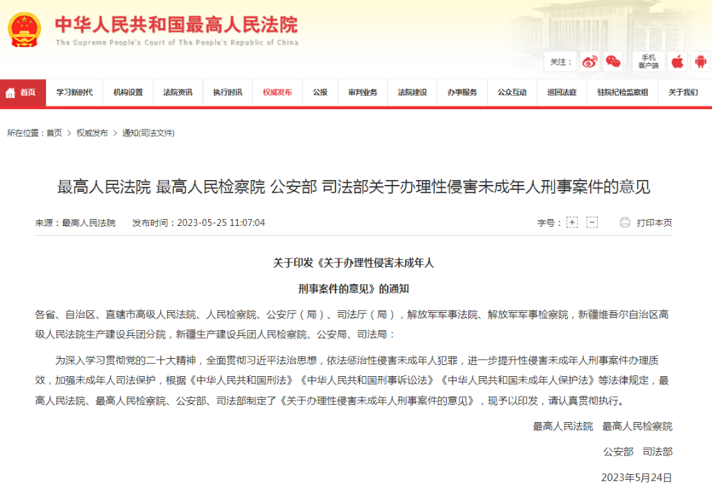 最高人民法院、最高人民检察院25日联合发布关于办理强奸、猥亵未成年人刑事案件适用法律若干问题的解释。最高人民法院、最高人民检察院、公安部、司法部联合发布关于办理性侵害未成年人刑事案件的意见。