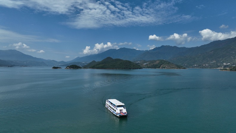 7月26日,游客在湖南省资兴市东江湖乘船游览(无人机照片)。