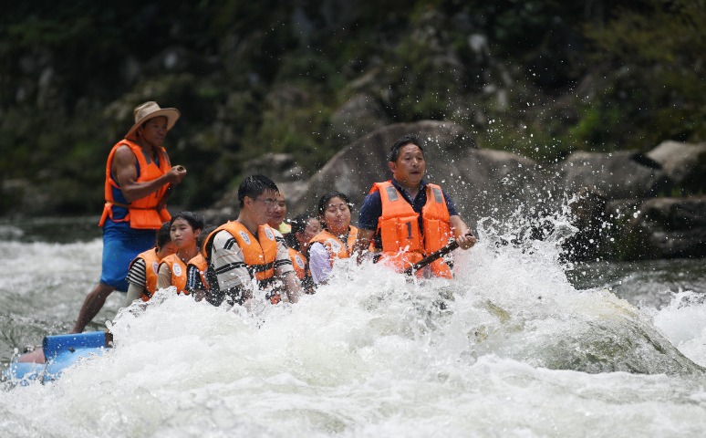 7月28日,游客在湖南省资兴市东江湖景区体验东江漂流。