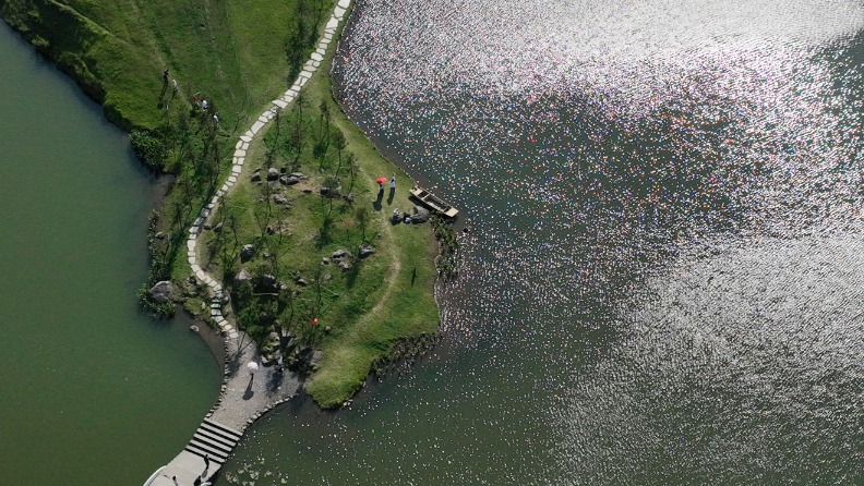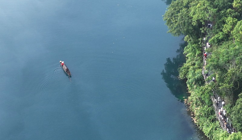 7月26日,游客在湖南省资兴市小东江游览(无人机照片)。