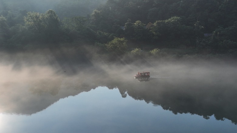 7月26日,游客在湖南省资兴市小东江上乘船游览(无人机照片)。