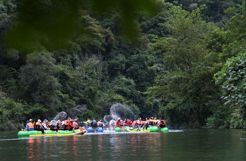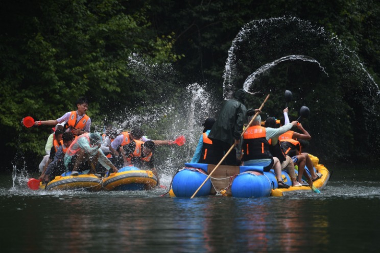7月27日,游客在湖南省资兴市东江湖景区体验东江漂流。