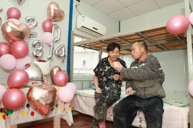 “虽然作为外地人在这里务工,但在项目工地感受到了家一样的温馨。”宋丰胜是泥工,妻子梅香珠是他的发小,婚后没多久,夫妻双双进城务工,开启了面对钢筋、板房、吊车、混凝土的工地生涯。“在工地上工作确实累,但有他在身边,累也高兴。”梅香珠说着,脸上洋溢着笑容。