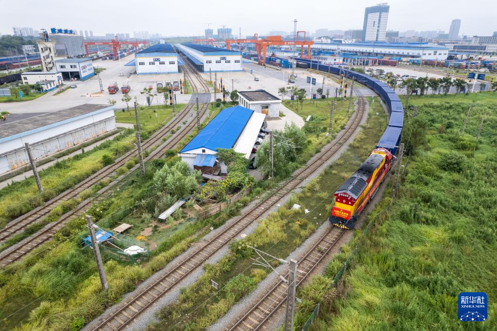 9月20日,一列装有50英尺集装箱的铁路多联快车从长沙北站开出(无人机照片)。新华社记者 陈思汗 摄