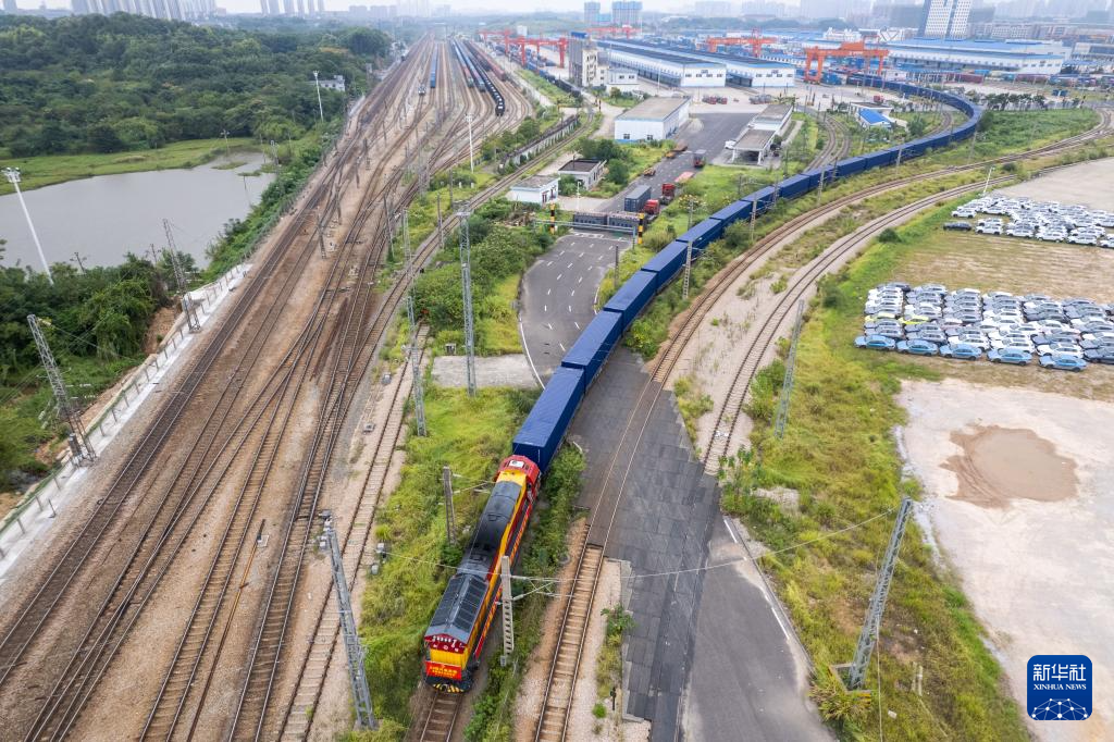 9月20日,一列装有50英尺集装箱的铁路多联快车从长沙北站开出。新华社记者 陈思汗 摄
