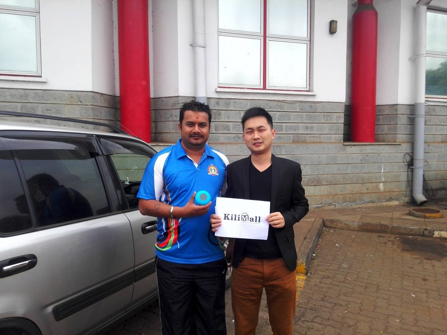 2014年,Kilimall团队成员为平台首单客户送货上门,图为联合创始人覃文与首单客户合影留念。(受访者供图)