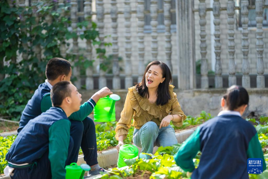 10月19日,常德市桃源特殊教育学校校长彭敏(右二)和学生参与劳动实践活动。