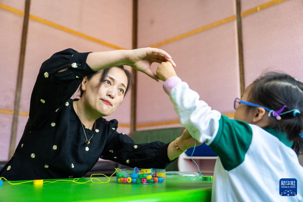 10月18日,常德市桃源特殊教育学校校长彭敏在单训室给学生做康复训练。