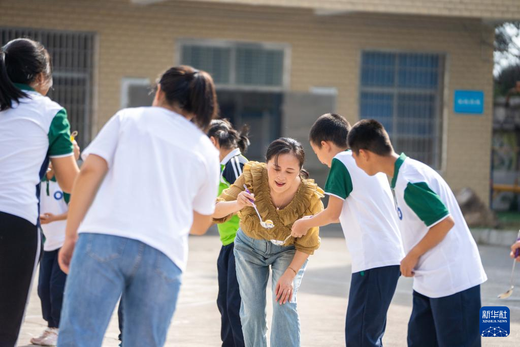 10月19日,常德市桃源特殊教育学校校长彭敏(中)和学生一起进行户外活动。