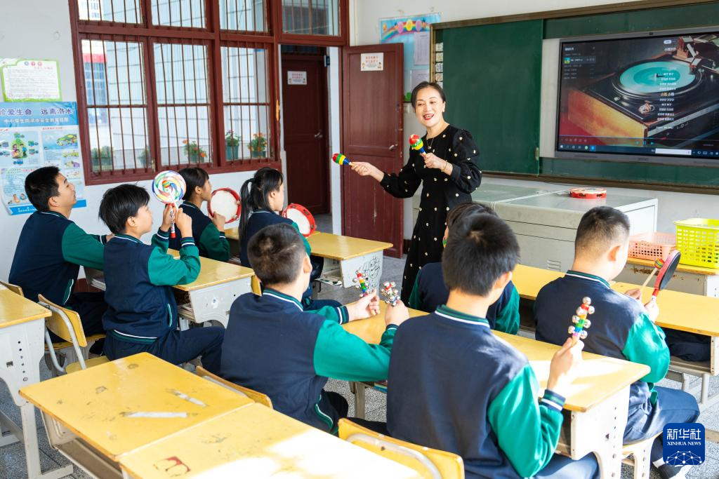 10月18日,常德市桃源特殊教育学校校长彭敏(中)给学生上音乐课。