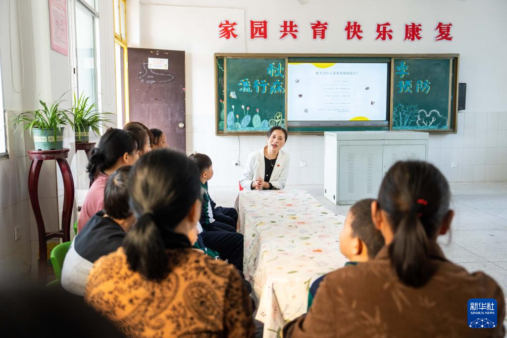 10月18日,常德市桃源特殊教育学校校长彭敏(中)在家长培训活动上与学生家长沟通。