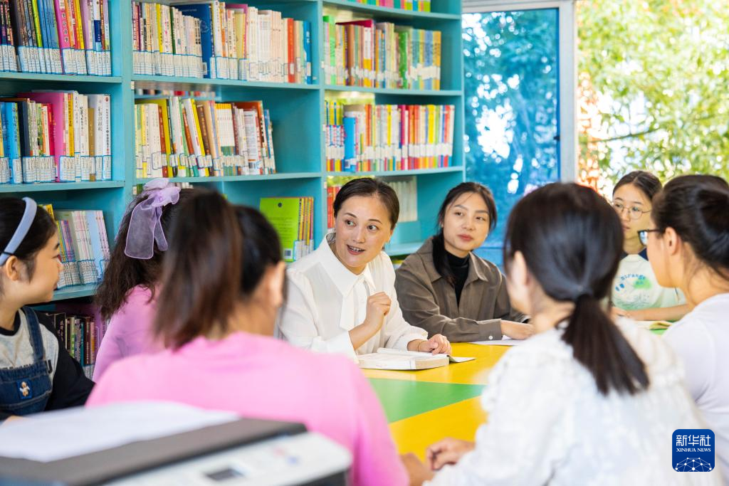 10月19日,常德市桃源特殊教育学校校长彭敏(中)在该校青年教师座谈会上与青年教师沟通。
