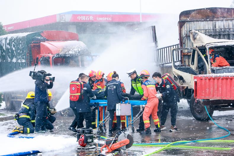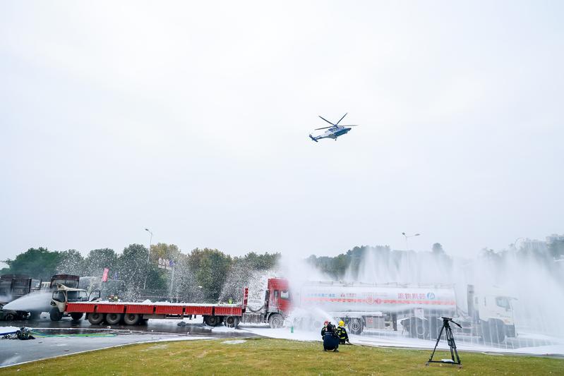 5车“连环追尾”,油罐车侧滑正在漏油,货车驾驶员被困,新能源轿车起火;高速公路对向车道,一辆混凝土搅拌车与一辆长途客运班车相撞……演练模拟了低温雨雪冰冻灾害导致的交通事故。随着警报拉响,高速交警闻警讯而动,第一时间赶到现场展开处置;在长沙市应急指挥中心的调度下,无人机起飞抛投灭火弹,火情得到有效控制;在高速交警引导下,消防救援站站灭火加强编队和危化品事故处置专业队火速赶至事故现场;长沙应急AW139直升机快速抵达转运伤员……