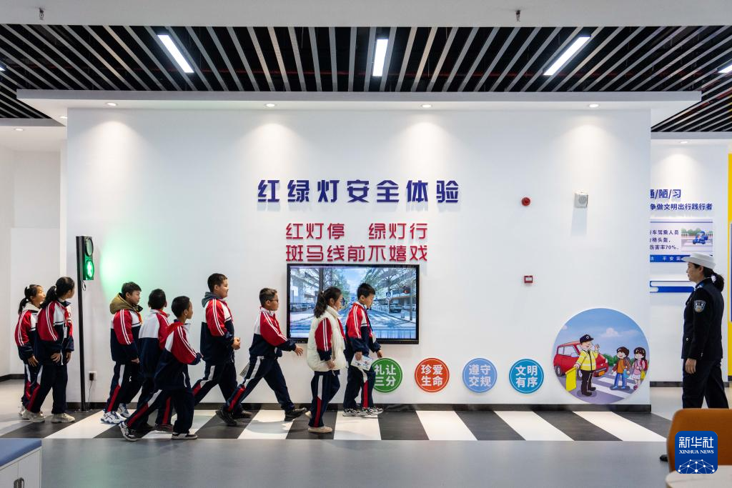 12月12日,在浏阳市交通安全宣传教育实践基地,学生通过模拟斑马线。新华社记者 陈思汗 摄