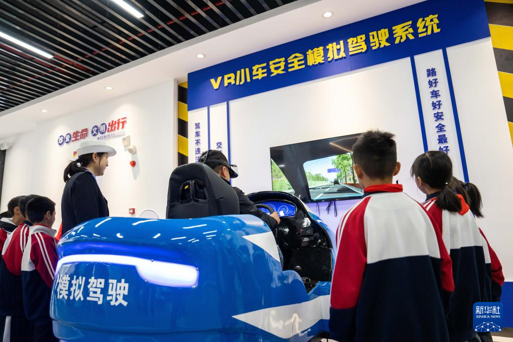 12月12日,在浏阳市交通安全宣传教育实践基地,学生通过观摩VR小车安全模拟驾驶系统了解交通安全注意事项。新华社记者 陈思汗 摄