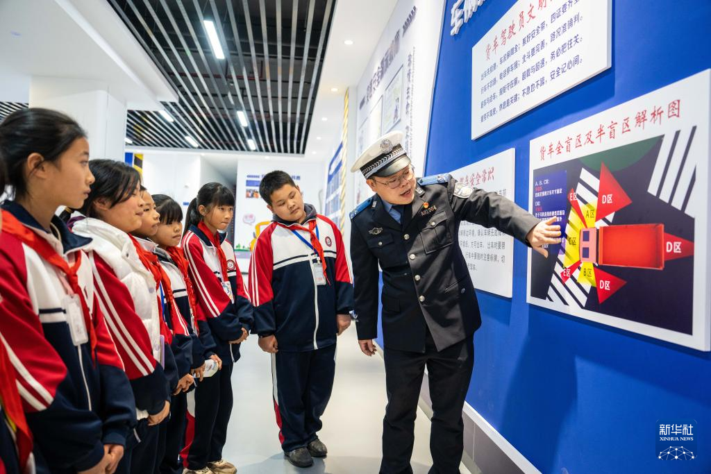 12月12日,在浏阳市交通安全宣传教育实践基地,民警给学生讲解货车视野盲区。新华社记者 陈思汗 摄