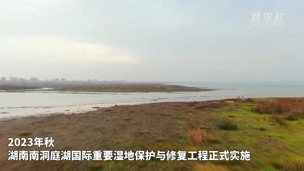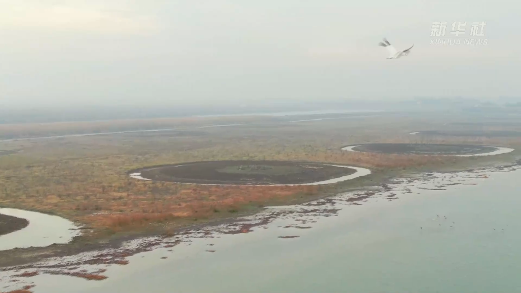 在湖南省沅江市南洞庭湖区的车便湖,数个巨大的圆形生态岛铺设在浅滩上,一汪碧水环绕着一个圆形小岛,小岛上栽种着数株小树。这是2023年秋开始实施的湖南南洞庭湖国际重要湿地保护与修复工程,像这样的生态岛在南洞庭湖传统候鸟聚集区域建设了97个,辐射区域面积达3.55万余亩的重要候鸟栖息地。