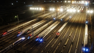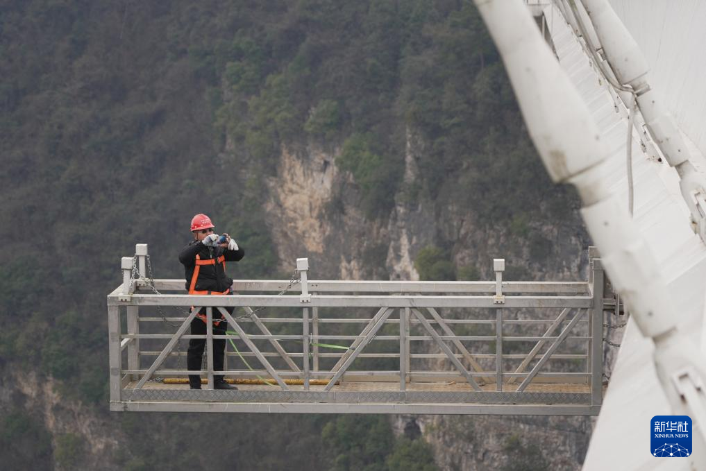 1月26日,张家界市大峡谷景区运维人员搭乘桥梁检修车对大峡谷玻璃桥主缆索夹等进行检查。