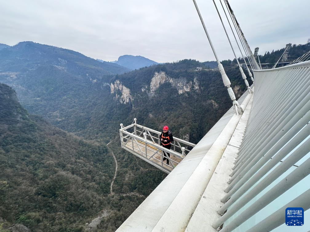 1月26日,张家界市大峡谷景区运维人员搭乘桥梁检修车清洁大峡谷玻璃桥。