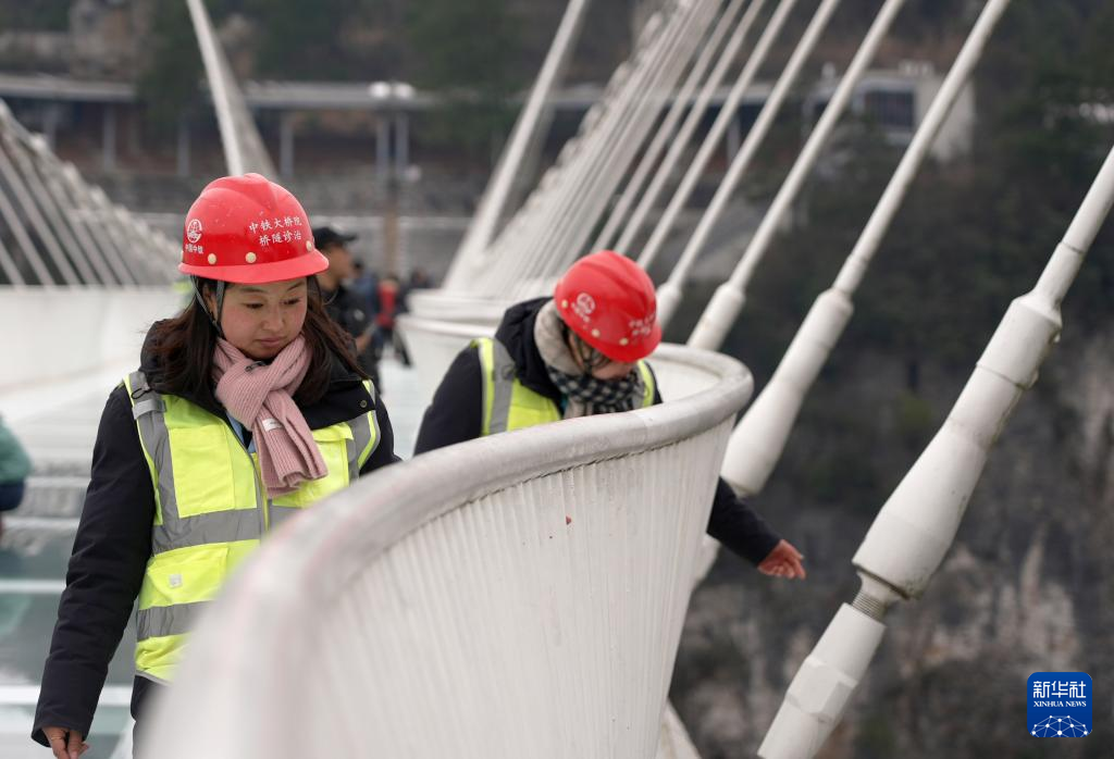 1月26日,张家界市大峡谷景区运维人员在大峡谷玻璃桥桥面进行巡检。