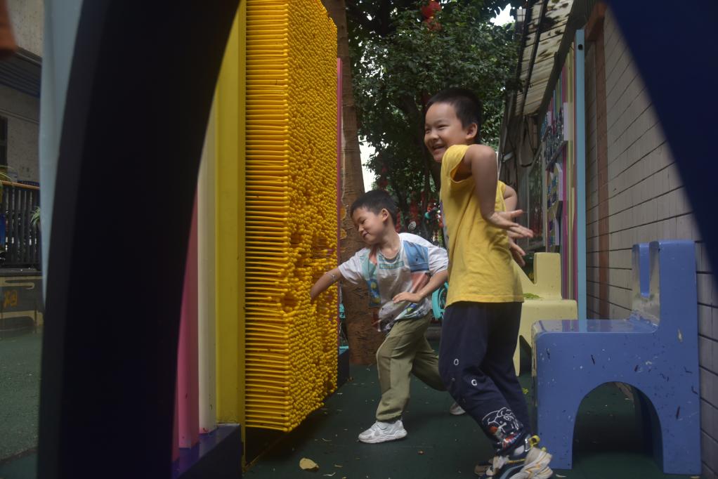 在广州市越秀区的广九社区,老城区旧楼之间的空间被利用起来,布置了色彩明快的儿童游乐设施,如儿童拓展游戏墙、童车小跑道、爬坡滑梯、跳房子、共享书屋等,社区被“童趣”点亮。