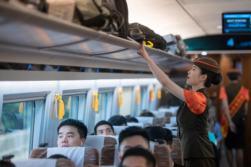 6月15日,在武汉至深圳北的G875次列车上,乘务员在整理行李架。新华社记者 伍志尊 摄