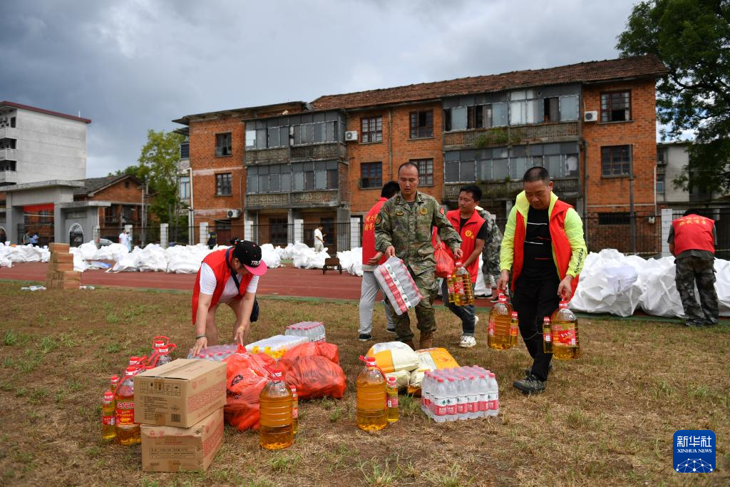 7月29日,在资兴市第一中学,志愿者和工作人员将准备投放至受灾乡镇的生活物资搬运上直升机。
