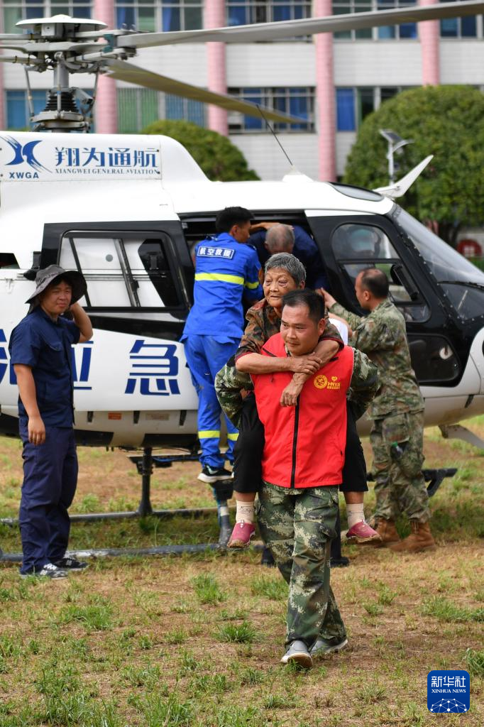 7月29日,志愿者将被转运至资兴市第一中学的老人背下直升机。新华社记者 陈振海 摄pagebreak