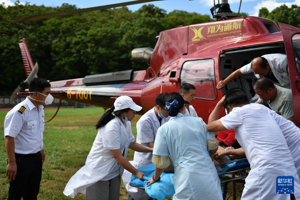 7月29日,在资兴市第一中学,医务人员从直升机上转运一名患者。新华社记者 陈振海 摄pagebreak