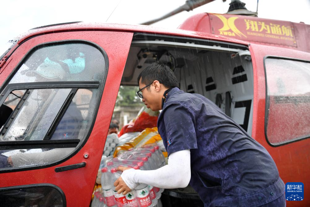 7月29日,在资兴市第一中学,工作人员将准备投放至受灾乡镇的生活物资搬运上直升机。新华社记者 陈振海 摄pagebreak