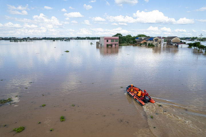 7月29日,在涓水湘潭县河口镇华中村堤段附近,抢险人员搜寻被困群众(无人机照片)。新华社记者 陈思汗 摄