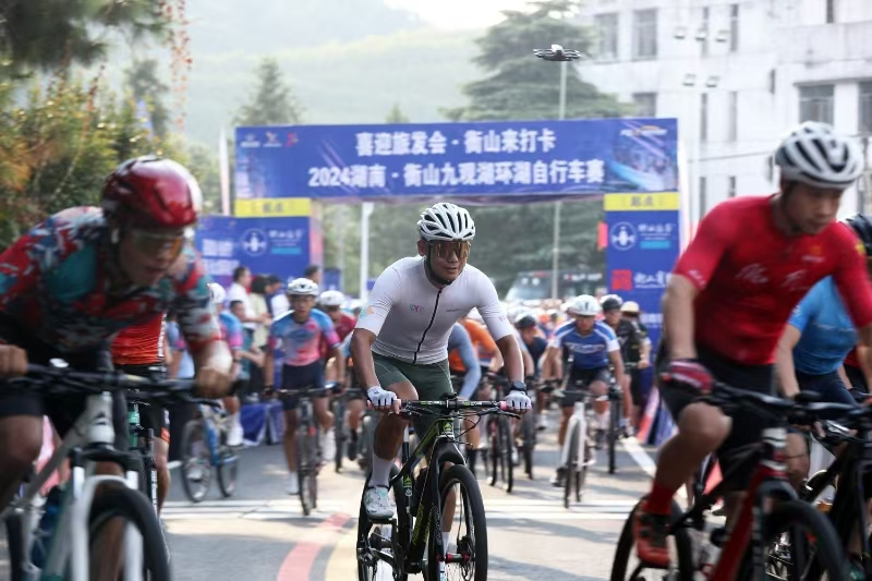 9月8日,2024“喜迎旅发会 衡山来打卡”湖南·衡山“九观湖”环湖自行车赛开赛。来自全国17个省市的761名“追风骑手”,在衡山环湖赛道上展开竞逐。