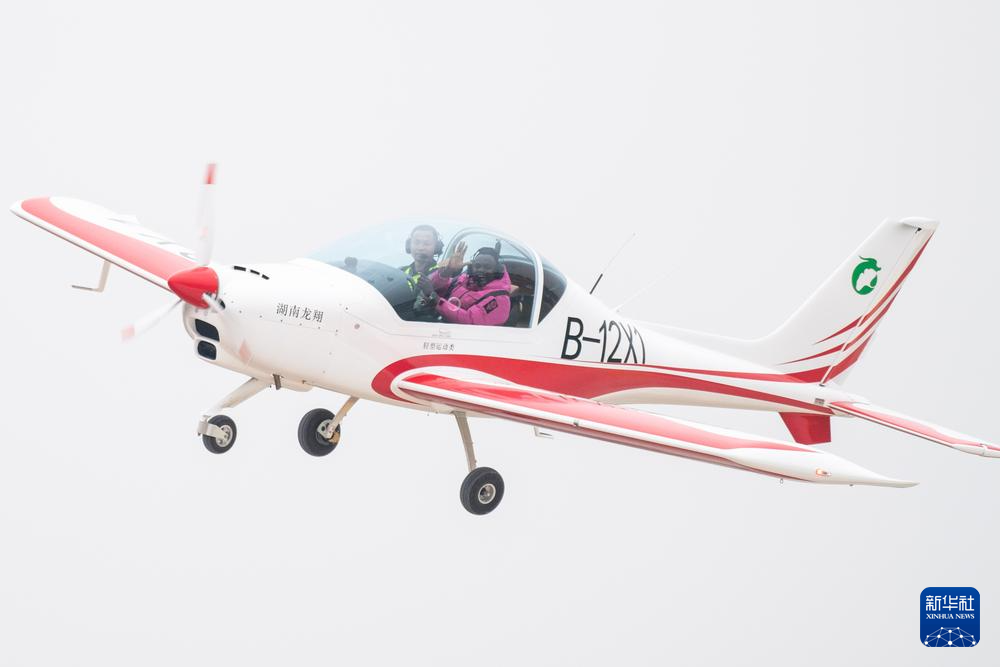 1月18日,在柳叶湖龙翔低空飞行营地,游客(右)乘坐固定翼飞机体验飞行。 新华社记者 陈思汗 摄
